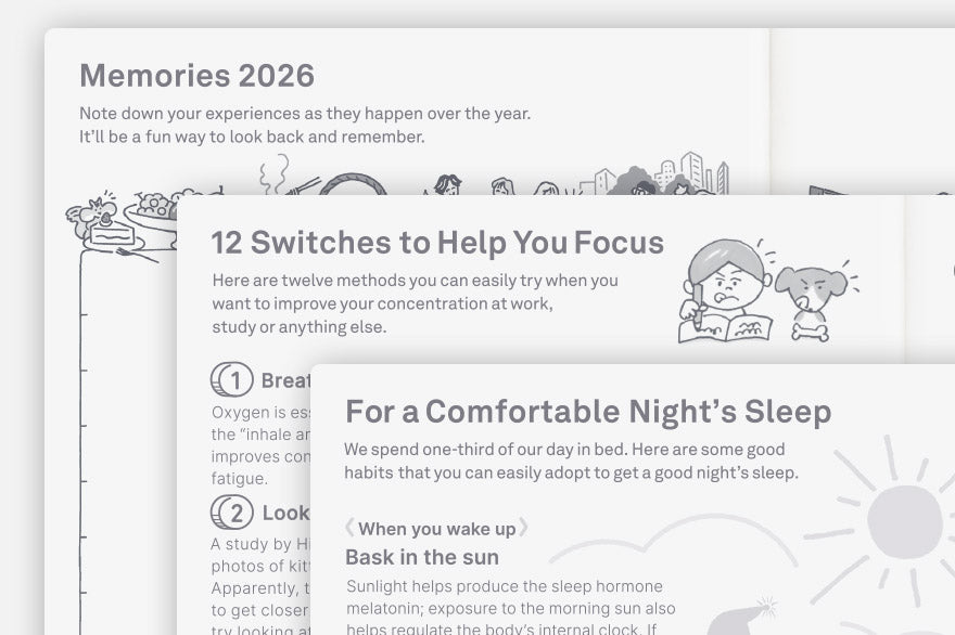 Additional pages include annual and monthly calendars, yearly index pages, and bonus sections such as Memories 2026, 12 Switches to Help You Focus, and For a Comfortable Night’s Sleep.